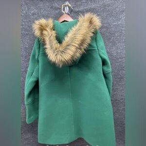 "Heather Grass" or "Alpine Meadow". Elegant emerald coat with faux fur hood. Features stylish zippered pockets.