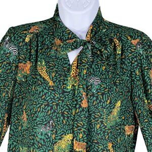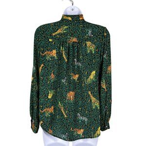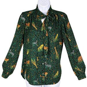 J.Crew Womens Green Jungle Print Long Sleeve Button Up Blouse Tie Neck XXS Artsy Art To Wear