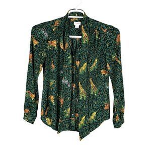 J.Crew Womens Green Jungle Print Long Sleeve Button Up Blouse Tie Neck XXS Artsy