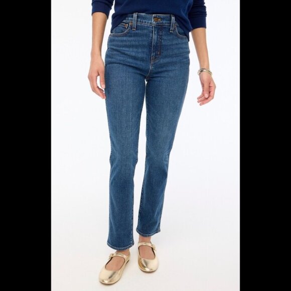 These gently worn, pristine jeans from J. Crew sit above the waist and have an easy fit through the hip and thigh with a straight leg. They feature the traditional 5-pocket styling, zip fly and are made of and all day stretch fabric, 99% cotton/1% elastane, which has low stretch with an easy feel and little bit of give.