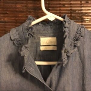 JCrew Womens Jean shirt with ruffle on the neck and on the wrists in very good shape