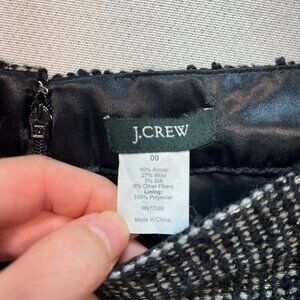 This J.Crew skirt features a classic straight and pencil design in a sophisticated black and white boucle tweed. Perfect for professional or casual settings, it offers a timeless look with a modern twist. Available in size 00 for a tailored fit.