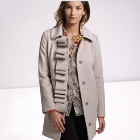Stylish and tailored wool blend coat with a ruffle front design. Features a flattering fit and an elegant beige tone for versatile wear.