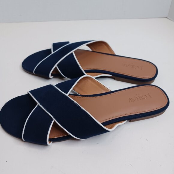 Has small glued stain shown in 3rd picture, Brand new store display item, no box. Please scroll picture for more details. J.Crew Women's 10M Blue White Color Fabric Sandal. Pet and smoke free home.