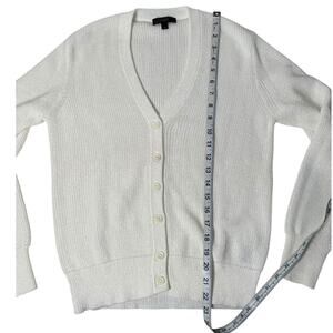 Elegant and timeless J.Crew ribbed wrap cardigan sweater in a soft ivory white with a subtle shimmer thread for a touch of sophistication. Features a flattering wrap design with button closure and a cozy ribbed knit texture. Perfect for both casual and dressy occasions.