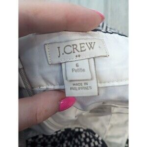 The J.Crew Women's Skirt in size 6P is a stylish and versatile addition to any wardrobe. This black and white geometric skirt features a sleek pencil silhouette with a straight design, making it perfect for casual occasions. Made from a comfortable cotton blend material, this skirt is lined for added quality and features a convenient back zip closure. Perfect for petit women looking for a knee-length skirt that combines both style and practicality.
