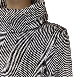 This J.Crew cowl neck sweater offers a stylish herringbone pattern in classic black and white. Crafted from polyester, it provides warmth and comfort, making it a chic addition to any wardrobe. Its versatile design effortlessly transitions from casual outings to more formal settings.