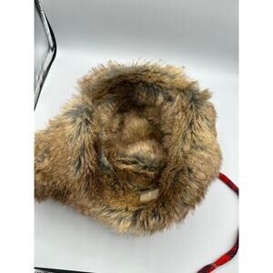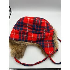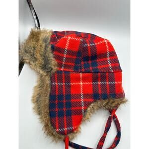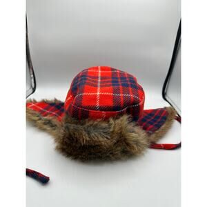 J.Crew Wool Trapper Hat with Faux Fur Lining. Red Plaid Pattern.