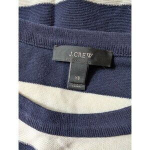 This J.Crew long sleeve shirt features a classic black and white striped pattern with a unique blue layered hem design. The XS size ensures a snug fit, while the soft cotton material adds comfort. This versatile piece can be styled for casual outings or more polished occasions.