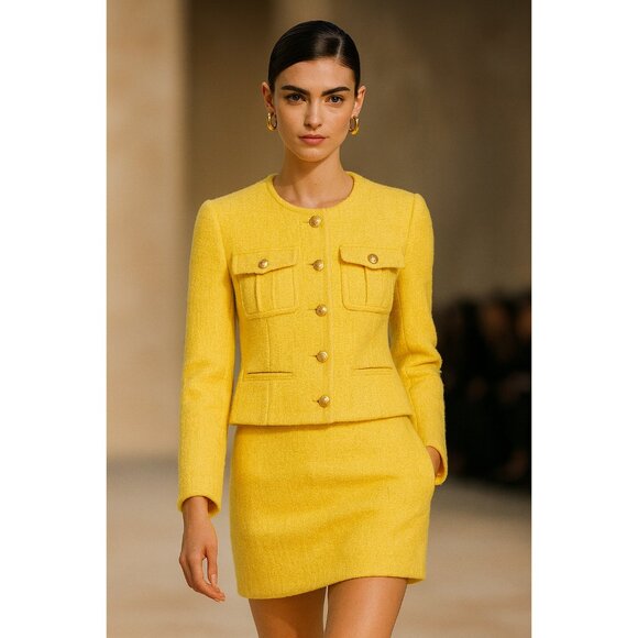 This J.Crew yellow tweed cropped jacket is a classic wardrobe staple inspired by iconic Parisian style. Featuring a textured tweed fabric, structured silhouette, and elegant button-front design, it pairs beautifully with wide-leg trousers, denim, or skirts.