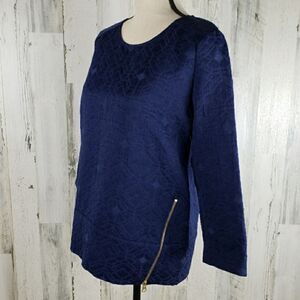 ~ Description: Navy top with gold zipper details, textured material has a quilted look, 3/4 length sleeves, thick non-stretch material, crew neck, button closure at the nape