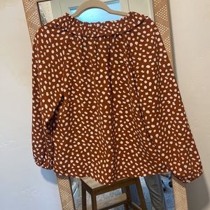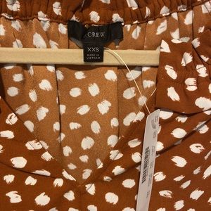 NWT J.Crew work top with ruffle detail on collar. Long sleeve. 100% polyester. Size XXS, but I’d say it runs large. Beautiful brick color with white detail.