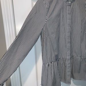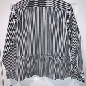 Long sleeve black and white pinstripe button down. Slight peplum hem.