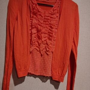 Stylish orange cardigan with ruffled details. Perfect for layering.