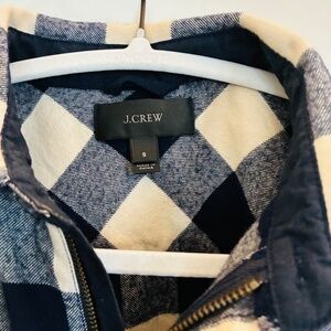 Used but in good condition . J Crew cozy Buffalo plaid pullover , women’s sz Small. In good pre-owned condition. Soft blend of cotton/wool/viscose in navy blue and cream/off white. Fabric does not have stretch! Pullover style with small collars and a half zip placket. Two buttoned flap chest pockets Long sleeves with buttoned cuffs Unlined. Will keep you warm.