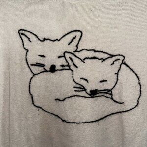 Adorable and cozy ivory sweater from Mercantile featuring a sweet embroidered design of two sleeping foxes. Lightweight knit with a classic crew neckline and long sleeves. Perfect for layering in cooler weather or adding a cute touch to your casual outfits.