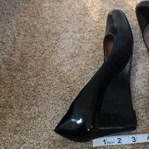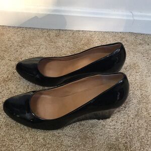J. Crew Factory SZ 9.5 black smooth Sylvia patent wedges. Gently used .