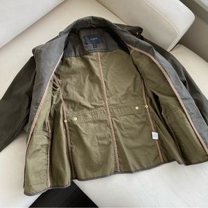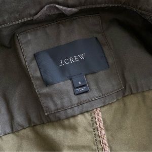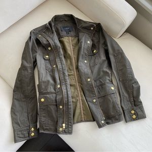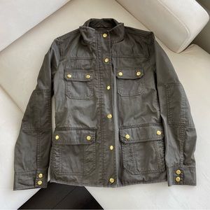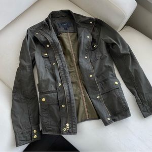 Utility jacket by J.Crew. Olive color with gold button and zipper accents. Four front pockets. Zipper and button front opening. Size S.