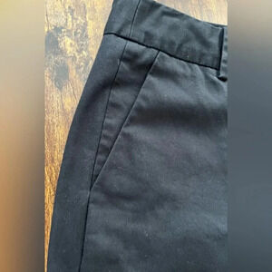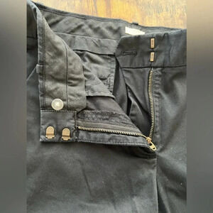 Womens J.Crew khaki style pant. 2- slit pockets on the sides. 2- slide in back pockets. Belt loops. 1- button, 2- hooks, zippered fly closure. Khaki pant feel, black color. Stretch. Very good used condition.