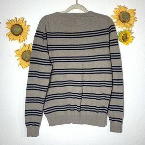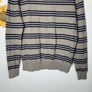 J.Crew men's striped cashmere blend crewneck Long Sleeve Sweater Size Medium. Its lights weight. The stripes are navy blue and the base color looks grayish.