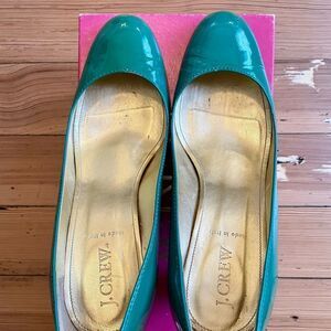 J. Crew patent leather midheels in bright peacock. Size 8.5. Good used condition, some scuffs from wear, left heel has a pen mark (shown) right toe scuff (shown). Plenty of life/ wear left! Glossy patent leather paired with wood heel.