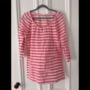 Women’s J.Crew pink and orange striped beach cover-up, size XS, lightweight, buttons in front, gathered sleeves, perfect for the beach, pit to pit 17 inches, shoulder to bottom 30.5 inches, sleeve length approximately 20 inches, great used condition- one tiny hole near back bottom, barely noticeable.