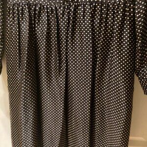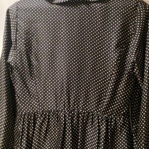 Very flattering, black and white polka dot silk dress, knee length dress with ruffle collar. Pair with pumps or sandals.