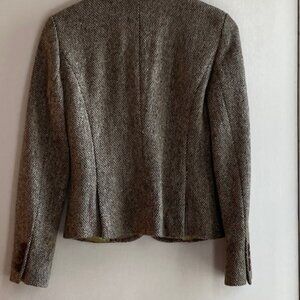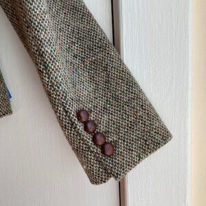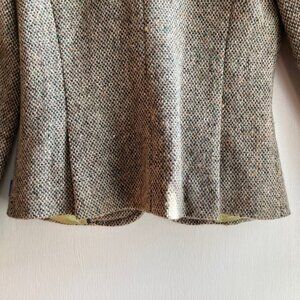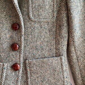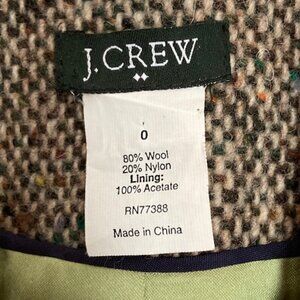 Excellent condition J. Crew wool blend tweed jacket. 0P. Perfect for fall and beyond with flecks of brown, rust, deep green. Patch pockets, leather look buttons: 3 on front, for on the sleeves. Princess seams, fully lined. Shoulder to hem 20", armpit to armpit 15", sleeve length from shoulder to wrist 23"