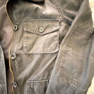 I. Crew like new gray/charcoal 100% cotton vintage distressed utility jacket with front pockets and zip front and button front. Collared. See pics for measurements.