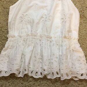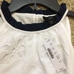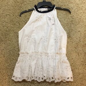 This NWT White eyelet top has a darling peplum, with a navy ruffle around the neckline. It zips up the back.