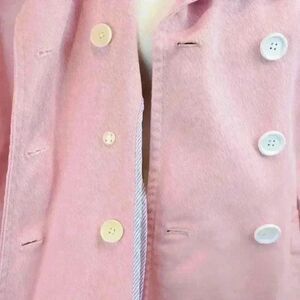 Chic double-breasted cotton twill pea coat in a rare baby pink shade. Features front flap pockets and a back belt for a tailored silhouette. Warm, stylish, and in excellent condition.