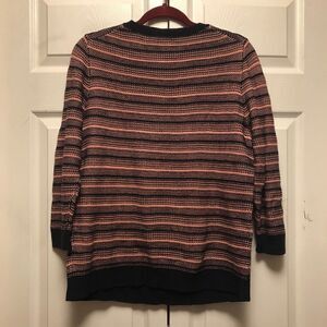 This sweater is in great pre-owned condition. The stripes are interwoven pink and navy blue. There is a small snag (see pic), but that is fixable. It is soft and comfortable.