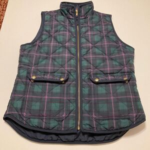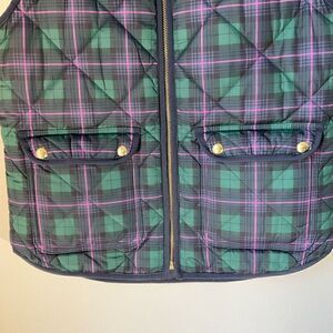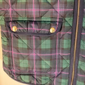 Beautiful puffer j crew plaid vest, Small. Green, navy and pink tartan plaid. Gold hardware - zip front. Patch snap pockets. Super warm Ralphlaurenchristmas heritage outdoorsy Flat lay L 23.5”, 20” P-P. (Matching sweater is also available in my closet) #preppy #darkacademia #puffervest