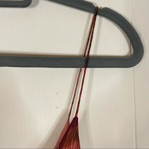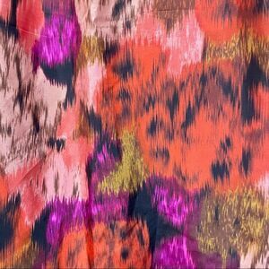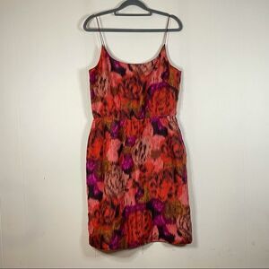 This beautiful sip dress is in excellent pre-owned condition. The cut has a very retro 60’s cocktail dress feel to it. The pattern is a sort of abstract floral. It has spaghetti straps, zips in the back and has an elastic waist. It is knee length with a slit in the back. It’s perfect for a cocktail party or night out!