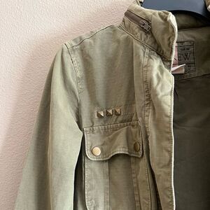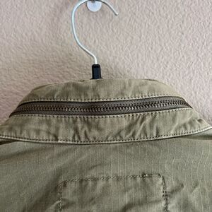 J. Crew green utility jacket in XS. Has a hood that can be rolled inside the collar. Gold stud detailing. In excellent condition!