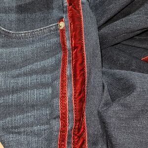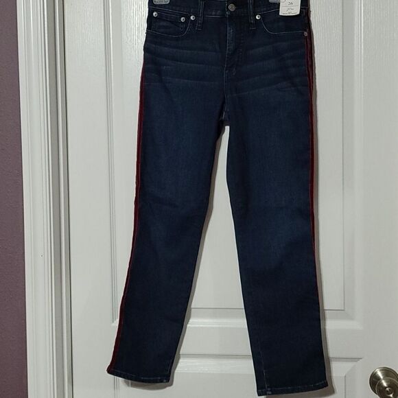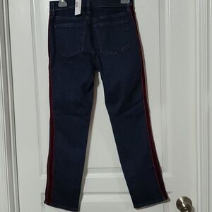 NWT. Beautiful jeans by J. Crew. They are Vintage Straight with Perfecting Pockets. Beautiful maroon colored velvet stripes on the side of each leg. They do stretch. The size is 26.