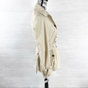 J Crew Khaki Travel Trench jacket. Sand / taupe color with interior yellow and orange circle pattern. brown button closure and hook-and-eye collar. belted waist with pockets. cotton blend and no size tag but measurements are armpit to armpit 17”. Length 26”. Measuring as a small. No holes or stains.