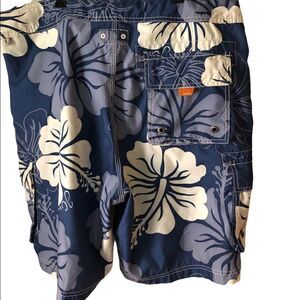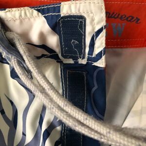 Very nice tropical swim trunks with Velcro pockets and fly also has lace up detail. Well made and classic!!! VGUC from smoke free home.