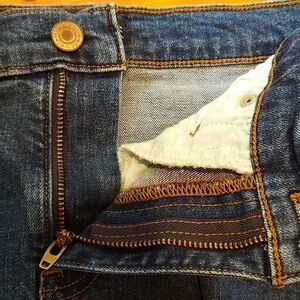 J. Crew Mercantile Denim Jean Skirt. 5-pocket styling with a zipper fly and a copper branded button closure. Raw hem, leather patch in the back and copper hardware. 99% cotton, 1% elastane in a size 00.