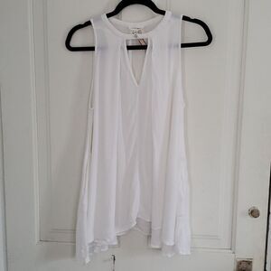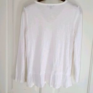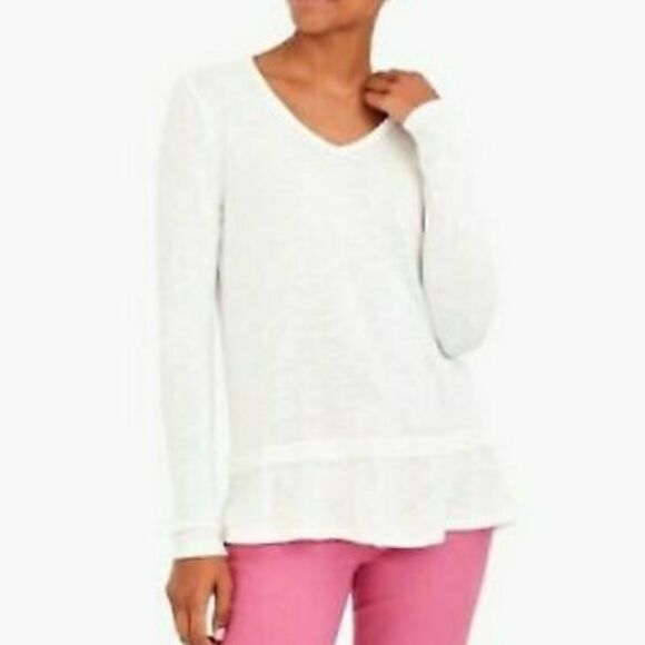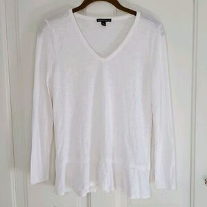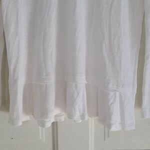 In like new condition. Peplum style ruffle at Boston. Vneck and long sleeves. Heathered white material.