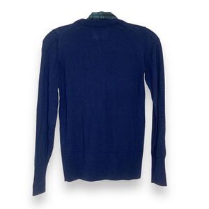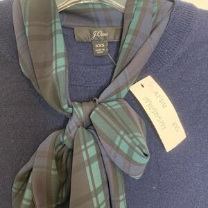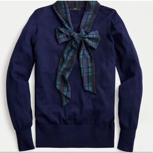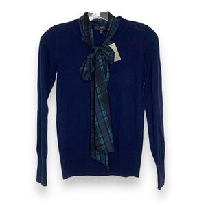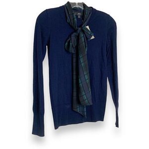 J. Crew Merino Wool Navy Blue Mockneck Sweater Tartan Scarf Tie Women’s Size XXS
