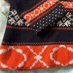J. Crew cute fall sweater. No major flaws. Buttons up the neck in back. I’m 98% sure it’s navy and orange but it’s so dark it could probably pass for black if not up against something that shade. Has stretch but I wouldn’t label it stretchy. Soft and comfortable.