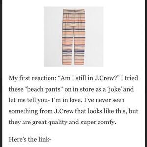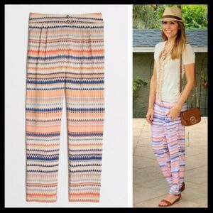 So cute! Flowy beach pants with slightly tapered ankle. Double button closure, hidden side pockets. Approx 26.5” inseam and 10” rise. Beautiful peachy pinks, blues, cream, and white. Stripe printed pattern. NWOT printed pants.