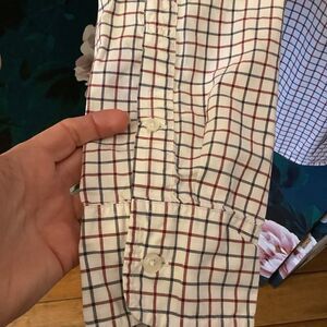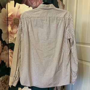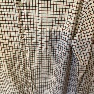 100% white cotton button down with red and blue grid pattern. Very nice. Size large.