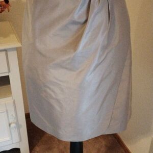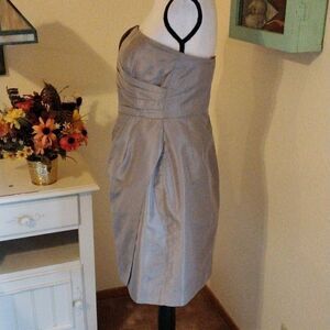 Pretty bronzy strapless shimmery silk dress. The top is folded and has support and an extra layer with a zipper to keep everything in place. Pleats at skirt and a faux wrap front. Size 8 measures 36 at chest, 28 at waist, 38 at hips, 27 long from under arm to hem. Simple, but stunning!