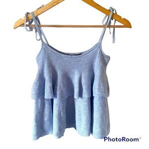 J. Crew tiered blue top 100% merino wool. Color is heather breeze. Finished with flirty shoulder ties, this tiered ruffle top makes every pair of shorts and pants in your closet better. Perfect staple piece for a layered look. Sweater tank.