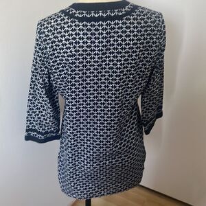 Step out in boho-chic style with this stunning J. Crew Tunic. Crafted from 100% cotton, this tunic features a flattering V-neckline and trendy 3/4 sleeves. The eye-catching color-blocked design adds a playful touch, while the ruched detailing adds a touch of elegance. With its vibrant pattern, dominated by shades of blue, this tunic effortlessly blends comfort and style for a fashion-forward look. Perfect for those who embrace a bohemian aesthetic, this J. Crew tunic is a must-have addition to your wardrobe.
