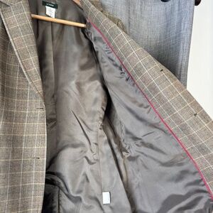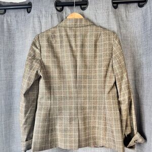 Classic J.Crew wool plaid blazer in rich brown tones with a clean, tailored fit. Features a double-button front, notched lapel, and subtle shaping through the waist for a flattering silhouette. The plaid pattern gives it a timeless, heritage look that works beautifully for both office and casual styling. Fully lined and well-constructed, with crisp detailing throughout.