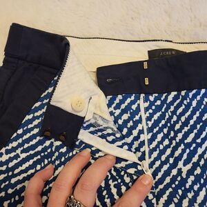 J.Crew blue/navy blue/white faux animal print shorts, size 8, button/slide clip/zipper closure, 2 front pockets, 2 faux back pockets, 98% cotton 2% spandex, excellent condition.