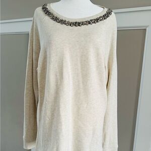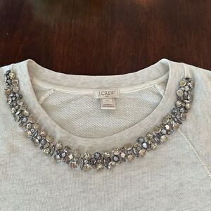 Step up your style in this classic sweatshirt by J. Crew with a rhinestone trimmed neckline. Cotton, polyester blend. Length 25” x Width 21” pit to pit. Like new.